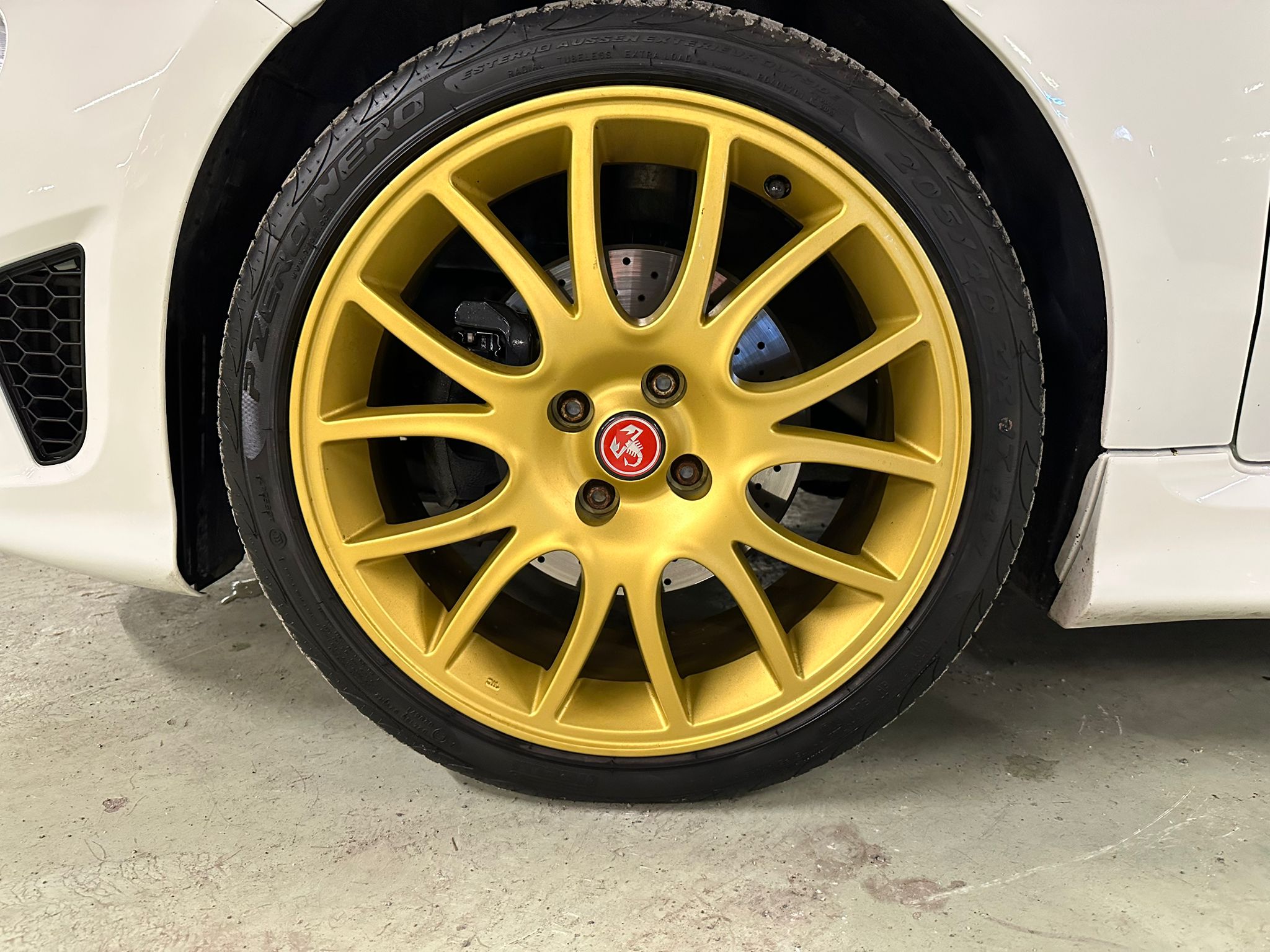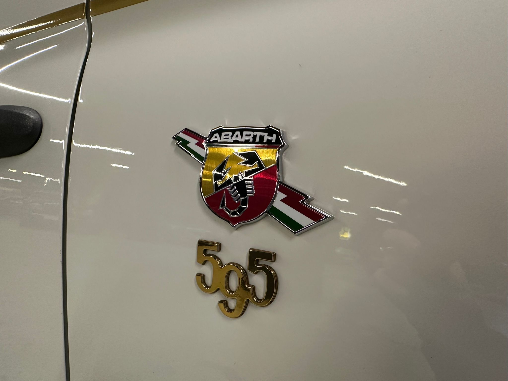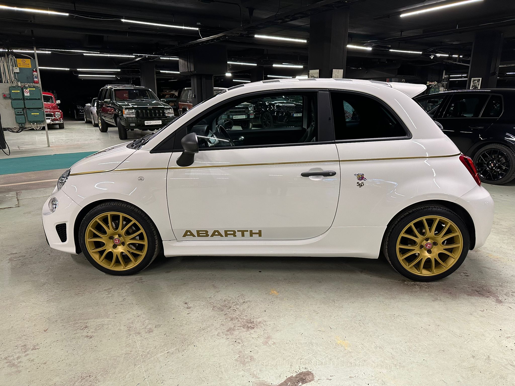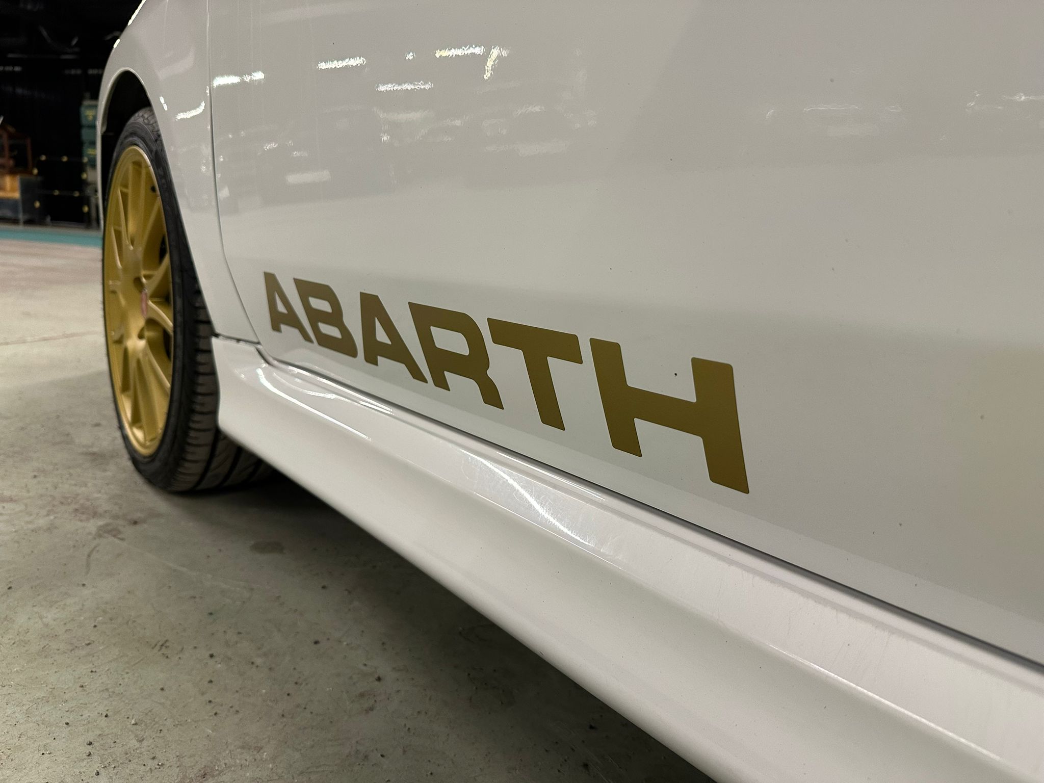 Abarth 595 Scorpioneoro i elegant vit kulör med guldigt livery.